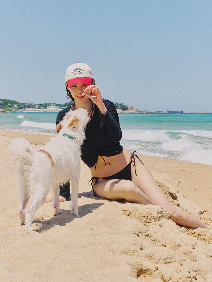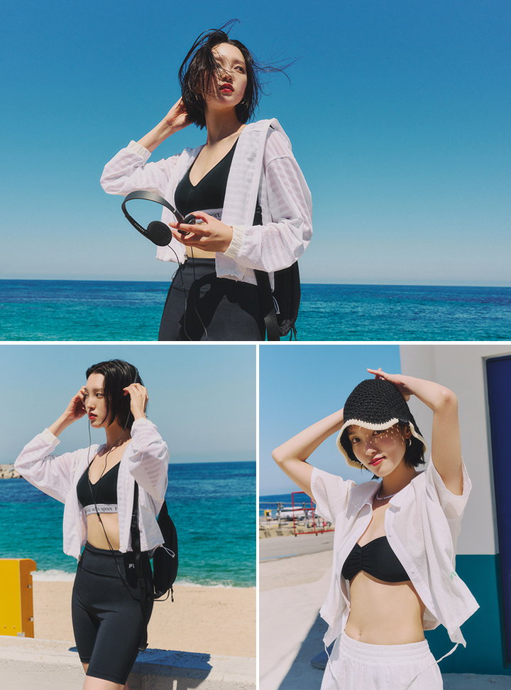 ‘스포티’한 인상이 강한 래시가드도 충분히 관능적일 수 있습니다. 섬세한 셔링 디테일과 그 아래로 살짝 드러나는 허리선, 감각적인 스트랩 디테일까지. 휠라의 냉감 스트링 포인트 긴팔 티로 색다른 래시가드 룩을 연출해 보세요. 상체보다 하체에 자신 있는 이들이라면 아슬아슬한 비키니 바텀을 더해 과감한 룩에 도전해 보시길.
