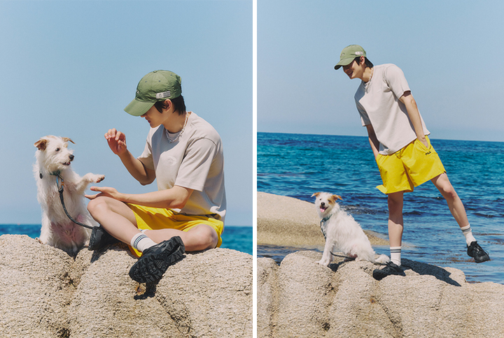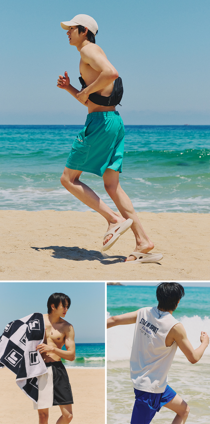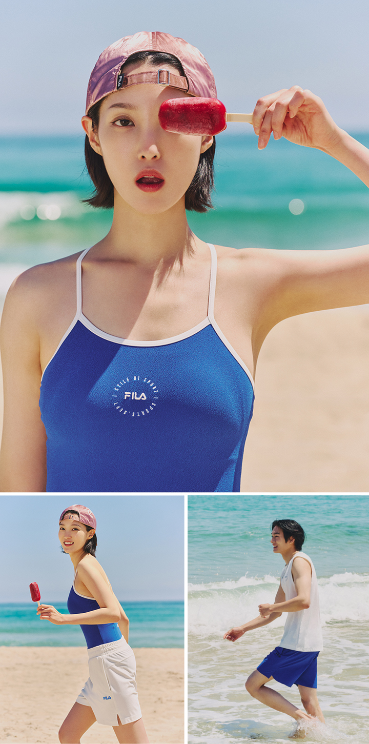 블랙은 어쩐지 지루하고, 화이트 또한 선뜻 손이 가질 않는다면 선명한 채도의 스윔웨어로 눈을 돌려보세요. 바다보다도 더 푸른 블루 스윔웨어의 활약도 기대해 볼 만합니다. 휠라의 블루 경량 테리 모노키니와 경량 스트레치 스포츠 팬츠는 커플들을 위한 바캉스 룩으로도 손색이 없습니다. 여기에 테리 소재의 쇼츠와 젖은 채 엉망이 되어버린 머리를 깔끔하게 감춰줄 볼캡까지 더하면 해변 근방 카페까지도 문제없을 시원한 비치 룩이 완성됩니다.