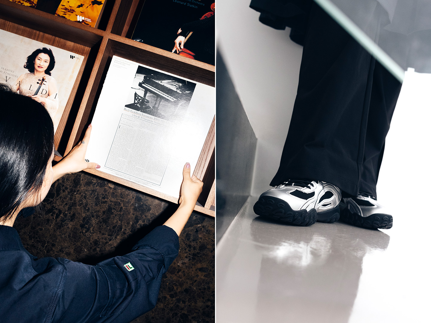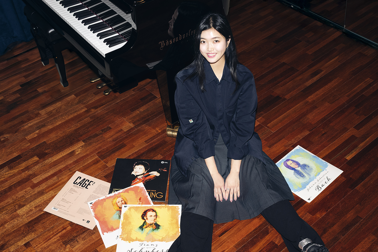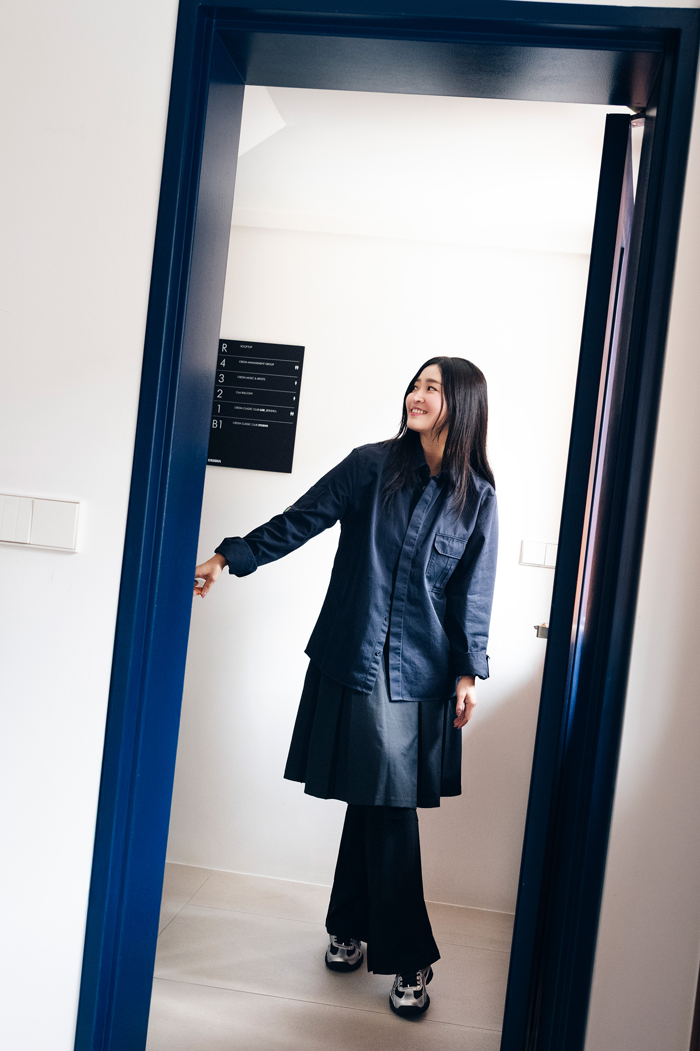 “웨어러블하면서도 어디든 매치하기 좋은 옷으로 골랐습니다. 평소 일상 생활에서는 편하게 입을 수 있는 건 물론, 공연장에서 일할 때 입기에도 무리 없는 스타일이에요. 공연장에서는 연주자가 돋보여야 하기에 스텝들은 보통 어두운 컬러를 입는 편이에요. 상의로 입은 블랙 셔츠는 심플하지만 로고 포인트가 있어 은은하게 개성을 살려주고, 하의는 스커트가 팬츠에 레이어드 되어 있어 활동이 편해 실제 업무할 때 자주 손이 가더라고요. 두 가지가 세트가 아닌데 셋업처럼 자연스럽게 매치되어 더 스타일리시해 보여요.”