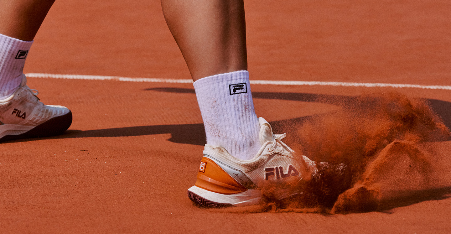 아웃솔에 묻은 흙이 빠르게 제거되는 패턴이며, 그립력이 좋아 균형 잡힌 슬라이딩을 할 수 있습니다. 휠라에서는 ‘엑실러스 3 T9’ 모델을 클레이 코트 버전으로도 선보이고 있습니다.