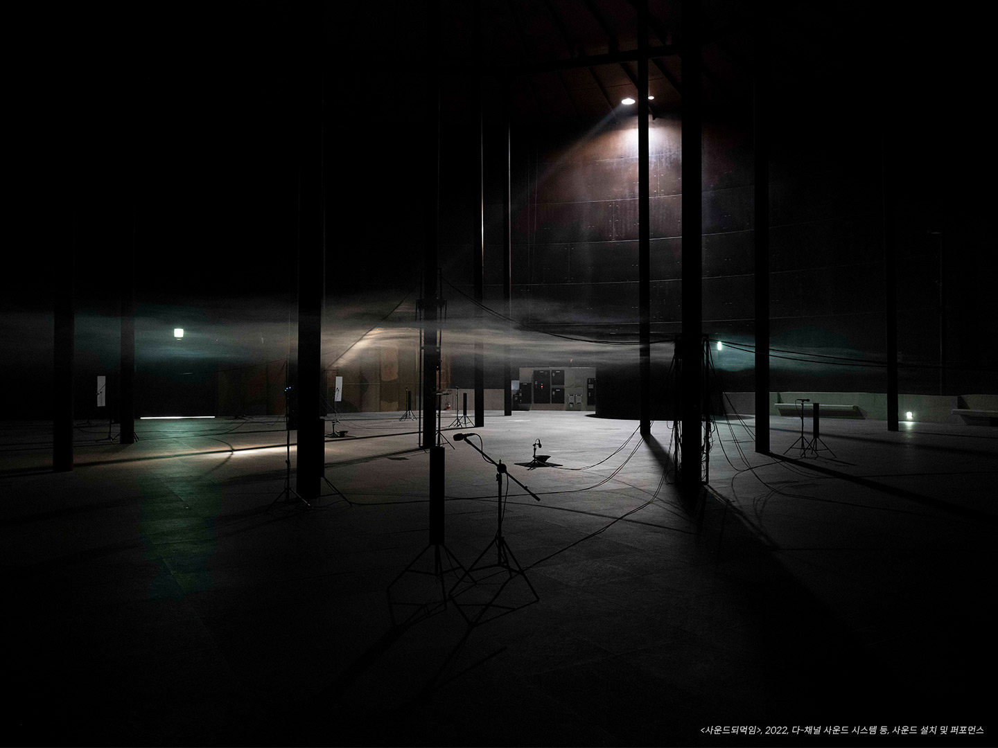 <사운드 되먹임>이란 작품이에요. 상암에 있는 문화비축기지에 마이크와 스피커 16쌍을 설치해 소리를 만들어냈어요. 과거 석유 탱크였던 공간을 리모델링한 공간으로 거대한 원형으로 이뤄져, 잔향이 오래 남는 특징을 가지고 있어요. 이 잔향이 마이크에 입력되면 스피커가 출력하고, 스피커가 출력한 소리를 다시 마이크가 입력하고, 그 소리를 스피커가 출력하기를 반복하면서 소리가 증폭되는 거죠. 출력과 입력을 반복하는 ‘피드백’ 기법을 활용한 작품이에요.